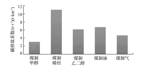 按此方法并选取典型工艺,分别测得典型现代煤化工产品的碳排放系数如图4所示。现代煤化工产品中,煤制甲醇的单位产品CO2排放量最低,这主要是由于其工艺流程较短,公用设施也较少;煤制烯烃的单位产品CO2排放量最高,主要是由于其工艺流程较长,公用设施也较多。