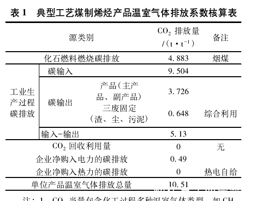 以鄂尔多斯盆地煤制烯烃项目为例,估算煤制烯烃企业碳排放系数。装置规模为180万t/a煤制甲醇、70万t/a甲醇制烯烃,选取的典型工艺主要包括:水煤浆气化、内压缩大型空分、耐硫变换、低温甲醇洗、甲醇合成、甲醇精馏、DMTO、聚乙烯、聚丙烯以及配套锅炉、热电联产等公辅工程。煤制烯烃产品温室气体排放系数核算如表1所示。