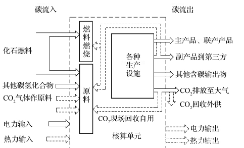 参照《温室气体排放核算与报告要求第10部分:化工生产企业》(GB/T.10—2015),化工生产企业的温室气体排放为各个核算单元的化石燃料燃烧产生的二氧化碳排放、生产过程中的二氧化碳排放和氧化亚氮等其他温室气体排放,以及购入电力、热力产生的二氧化碳排放之和,同时扣除回收且外供的二氧化碳的量,以及输出的电力、热力所对应的二氧化碳量。化工企业按图2所示识别碳源流,并分别核算。